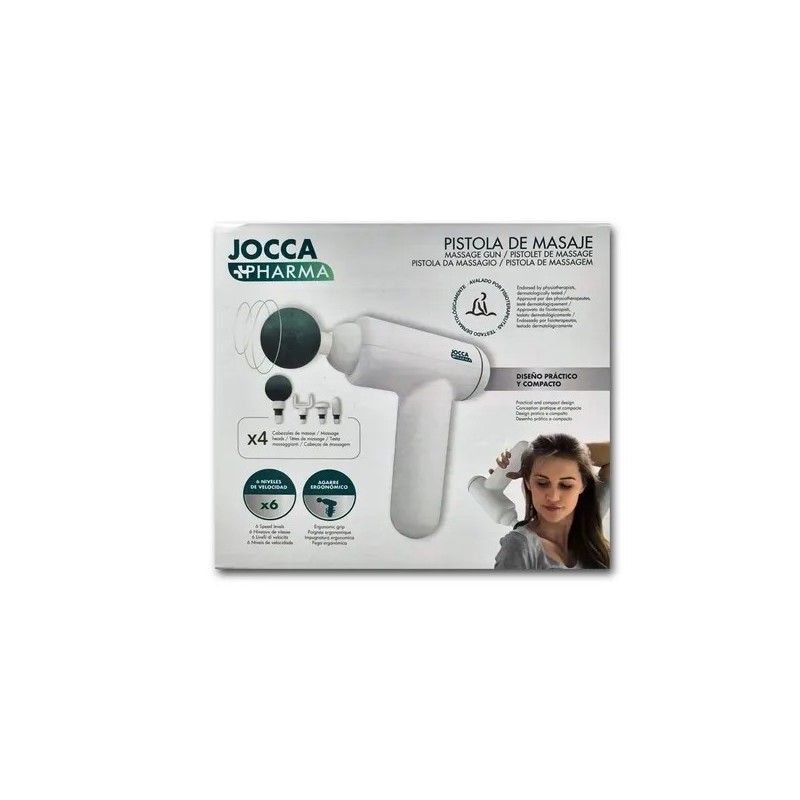 pistola de masaje jocca, incluye 4 cabezales diferentes con el que reducir la tensión muscular, eliminar la rigidez y el dolor. Se carga fácilmente en cualquier lugar con el cable usb, que viene incluido en la caja