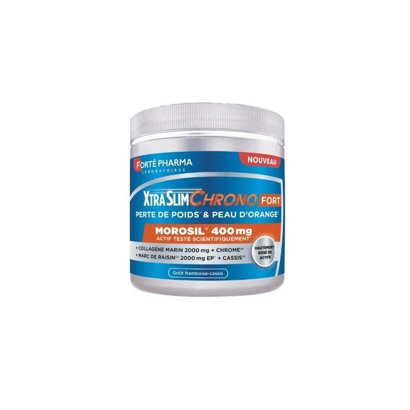 Xtraslim chrono, con su fórmula exclusiva ayuda a la pérdida de peso y a combatir la piel de naranja gracias a sus ingredientes activos de referencia: morosil, derivado de la naranja sanguina, es un ingrediente científicamente probado. Grosella negra que contribuye a la pérdida de peso junto con las medidas dietéticas. Colágeno marino hidrolizado de tipo i. Su bajo peso molecular (2000 daltons) facilita su asimilación. Extracto de uva ayuda a combatir la aparición de piel de naranja, el cromo ayuda a mantener los niveles normales de azúcar en sangre, y el zinc contribuye a la síntesis normal de proteínas. Gracias a su programa de 15 días, su formato en polvo diluible y su delicioso sabor de frambuesa y grosella negra, xtraslim chrono se integrará fácilmente en su rutina de pérdida de peso