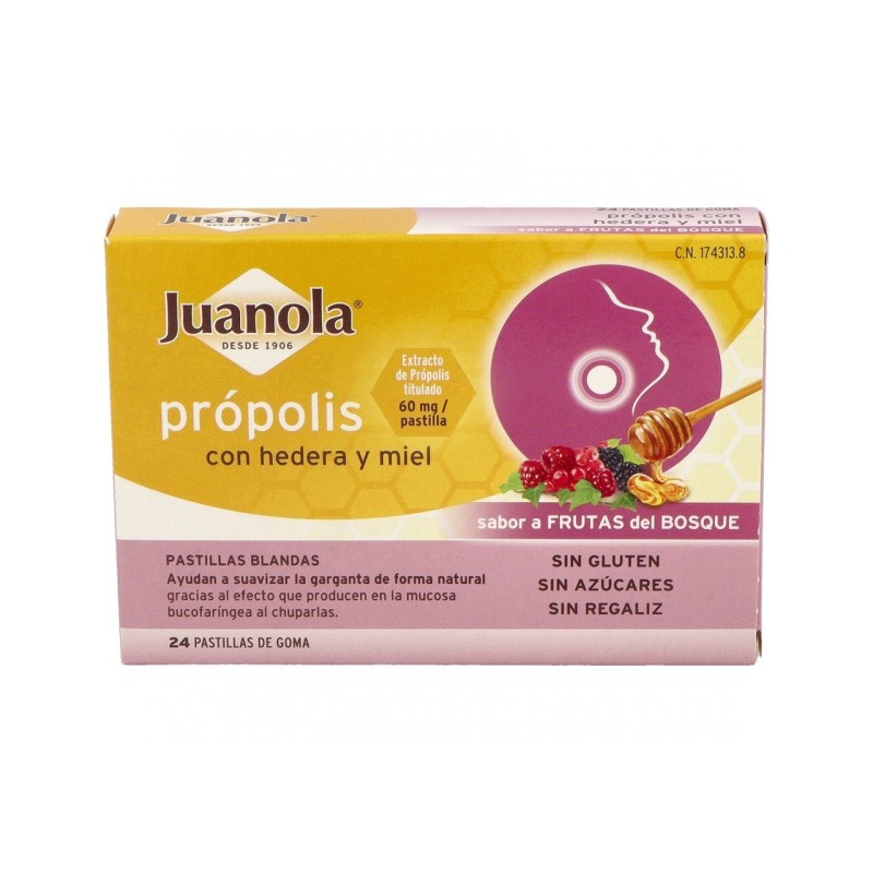 Juanola própolis + hedera con miel son unas pastillas blandas que combinan el efecto del extracto de própolis (60 mg/pastilla), el extracto de Hedera helix (12 mg/pastilla) y la miel (10 mg/pastilla) para suavizar la garganta gracias al efecto que producen las pastillas en la mucosa bucofaríngea al chuparlas.
